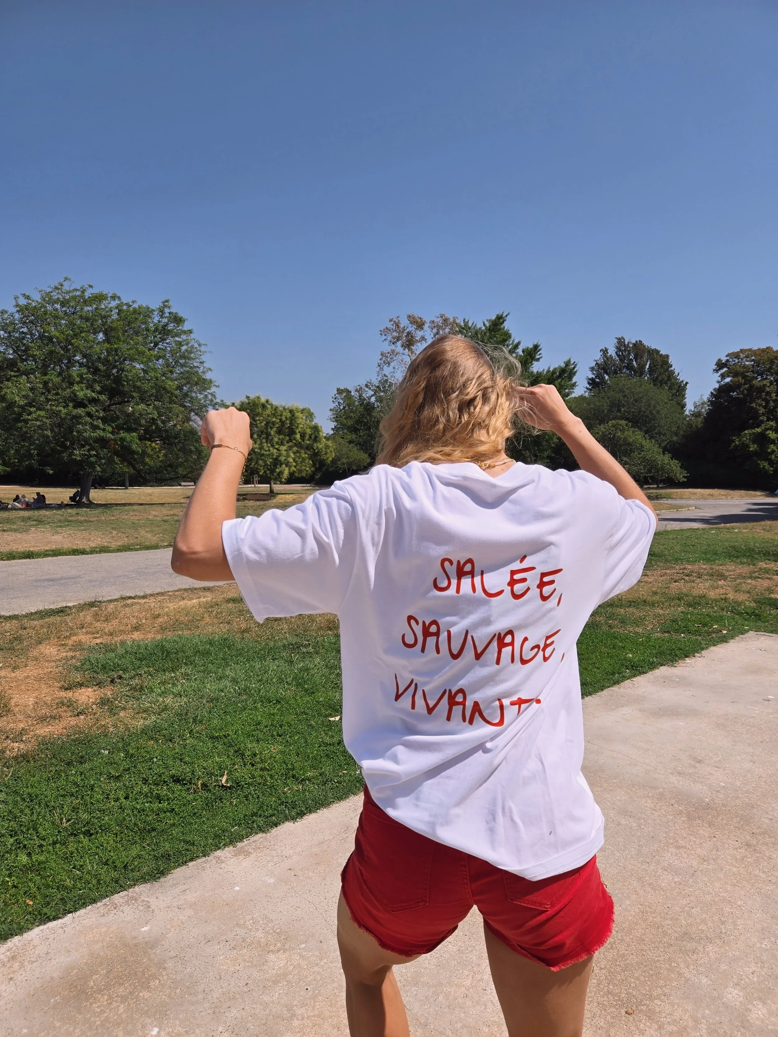 Inscription Salty House sur la poitrine, et Salée Sauvage Vivante au dos en grand.